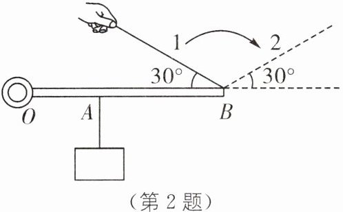 2. (2024·合肥庐阳区三模)如图所示,轻杆 OB(重力不计)可绕 O 点自由转动,OA 和 AB 长度之比为 1:2,物体重 15 N,小林在 B 处用细线沿方向 1 向上拉住轻杆,然后沿方向 2 向上拉住轻杆,轻杆始终在水平位置处于平衡,下列说法正确的是(