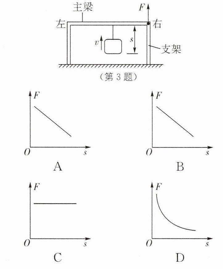 3. (2024·杭州上城区月考)在建造航空母舰过程中需要使用大型起重机"龙门吊",其示意图如下,它主要由主梁和支架构成,可以提升和平移重物。在重物匀速提升的过程中,右支架对主梁的支持力 F 与重物上移距离 s 的关系图像是(