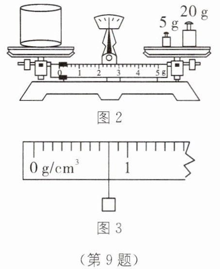 $ g/cm^3;$按该分度值在杠杆上均匀画出刻度线,即杆秤密度计制作完成。(4)用制作好的密度计测量某一液体密度时,将 100 mL 的液体倒入空塑料杯中,秤砣细线位置如图 3 所示,待测液体密度为