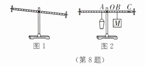 8. 如图所示,根据杠杆的平衡条件测量某种液体的密度,所用器材:轻质杠杆(自身重力忽略不计)、容积为 100 mL 的空桶、重为 0.5 N 的物体 M、刻度尺、细线。