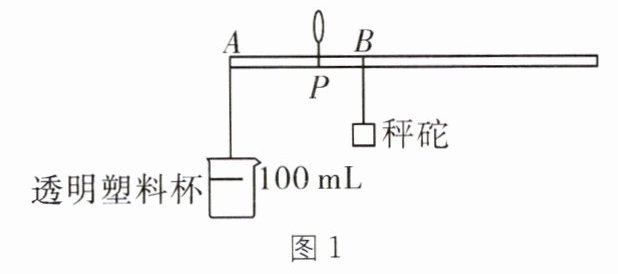 cm。(3)将 100 mL 密度为$ 1 g/cm^3$的水倒入塑料杯中,在液面处作标记,调节秤砣细线位置使杠杆再次在水平位置平衡,并在此时秤砣细线位置处标记为"1",此刻度线到提挂点 P 的距离为
