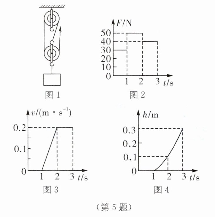 5. 用如图 1 所示的滑轮组装置将放置在水平地面上、重 100 N 的物体向上提升。当用如图 2 所示的随时间变化的竖直向上的拉力 F 拉绳时,物体的速度 v 和物体上升的高度 h 随时间变化的关系图像分别如图 3、图 4 所示(不计绳重和绳与滑轮之间的摩擦)。下列计算结果正确的是(