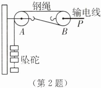 2. 高速铁路的输电线,无论冬夏都需要绷直,以保障列车电极与输电线的良好接触。如图所示为输电线的牵引装置工作原理图。钢绳通过滑轮组悬挂 30 个相同的坠砣,每个坠砣配重为 150 N,若某段时间内坠砣串下降了20 cm,不计滑轮和钢绳自重及摩擦,下列说法正确的是(