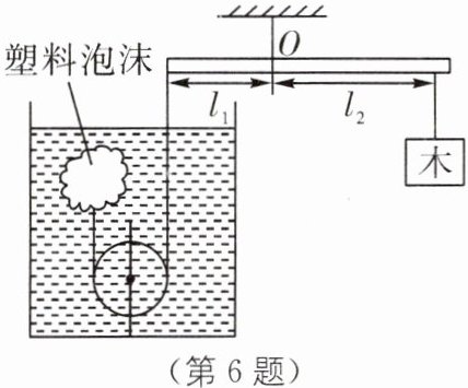 (2)在图中,根据杠杆的平衡条件可知 $F_{拉}l_{1}=G_{木}l_{2}$,$F_{拉}=\frac{G_{木}l_{2}}{l_{1}}$,代入数据解得 $F_{拉}=1.5N$,根据 $F_{浮}=G_{泡}+F_{拉}$,代入数据可知塑料泡沫浸没时受到的浮力 $F_{浮}=2.25N$。