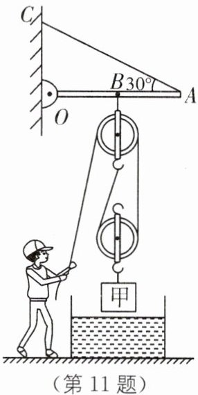 11. (2024·达州中考)如图所示,一重为200N,底面积为$0.4m^2$的方形玻璃缸(玻璃缸壁的厚度忽略不计),玻璃缸中装有重1000N的水。上方有一轻质杆OA,在绳子AC的拉力作用下可绕竖直墙上O点转动,现在OA的中点B处悬挂一滑轮组。已知每个滑轮重20N,滑轮组上悬挂着重300N的重物甲,将浸没的重物甲缓慢拉离水面后,玻璃缸中水位下降了5cm,(忽略物体带出的水,ρ水$= 1×10^3kg/m^3,g$取10N/kg)求: