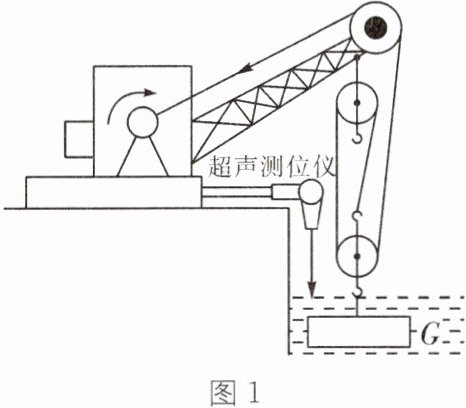 1. (2024·温州一模)如图1所示是用来打捞一封闭货箱的模拟装置设计。已知货箱重2500N,货箱高2.5m,动滑轮重500N,声音在水中的传播速度是1500m/s。在水面上用超声测位仪向水中垂直发射声波直至遇到货箱后返回,测位仪用时0.02s收到回波。货箱在水面下匀速上升时绳子自由端的拉力F为600N。(注:不计绳重和摩擦,不计动滑轮体积,g取10N/kg,$\rho_水= 1.0× 10^3\rm \ kg/m^3$)