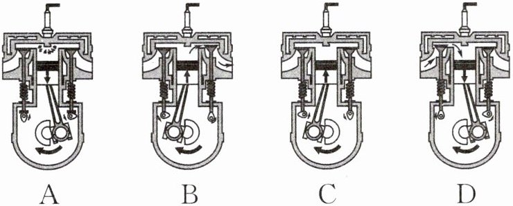 D [解析]压缩冲程后气体温度比吸气冲程中气体的温度高,吸气冲程中气缸内气体的内能最小。两气门关闭,活塞下行,为做功冲程,A 不符合题意;进气门关闭,排气门打开,为排气冲程,B 不符合题意;两气门关闭,活塞上行,为压缩冲程,C 不符合题意;进气门打开,排气门关闭,为吸气冲程,D 符合题意。