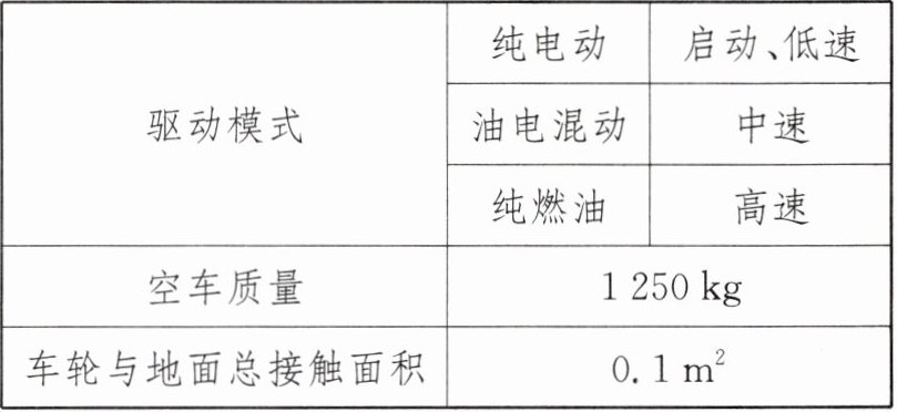 11. (2025·杭州西湖区月考)某款油电混动汽车的部分信息如表。某次测试,质量为50 kg的测试员驾驶该车以72 km/h的速度匀速直线行驶0.5 h。测试中,汽油机既向车轮提供动力,又向蓄电池充电,同时蓄电池又将部分能量通过驱动电机向车轮输送。(假设汽油完全燃烧,且忽略蓄电池和电机的热损失,$q_{汽油}= 4.6× 10^{7}\ \text{J/kg}$)