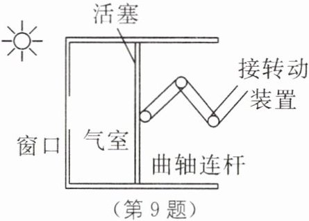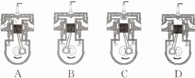 C [解析]由题图可知,控制窗口处射入的光能使气室中的气态物质循环反应,从而推动活塞输出机械能;这里将光能转化为机械能,使活塞向右运动(气室内的空气对活塞做功),相当于汽油机的做功冲程,此时两个气门关闭,燃气膨胀对活塞做功,使活塞向下运动,观察可知 C 符合题意。