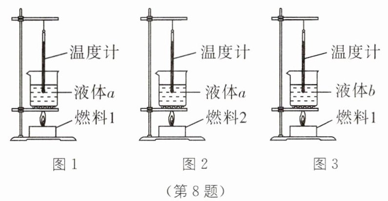 8. 实验班原创 如图所示的三个装置完全相同。燃料的质量相同,烧杯内的液体质量也相同。下列说法正确的是(