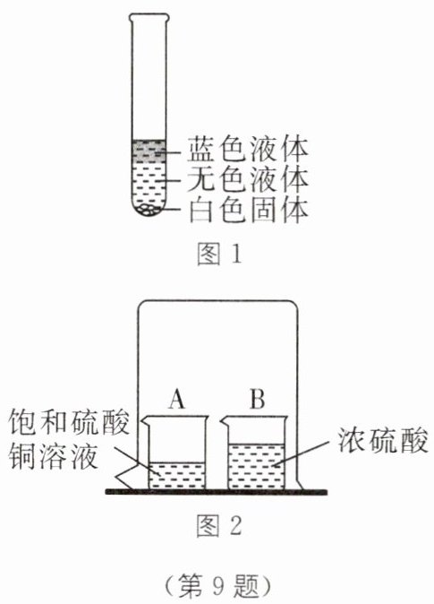 9. (2024·浙江中考节选)浓硫酸具有吸水性和脱水性。老师演示了如下实验:在一定量的饱和硫酸铜溶液中加入浓硫酸,可以观察到液体上部呈蓝色、下部为无色,出现白色固体沉积(如图 1),试管壁发烫。经检测白色固体是无水硫酸铜。请回答: