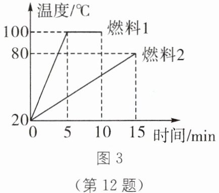 (4)另一组的小华也用图1所示的两套完全相同的装置进行实验,并重新在烧杯内加入初温和质量相同的水,燃料1和燃料2的质量相同,在燃料烧完后也画出了水的温度随时间变化的图像如图3所示,根据图3,燃料1和燃料2的热值之比为