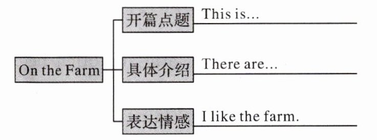 第一步:写前审题 体裁:说明文 人称:第三人称 时态:一般现在时 第二步:必备短语 1. my grandpa's farm 2. many animals 3. there be 4. on the farm 5. behind the tree 第三步:炼词成句 6. This is my grandpa's farm. 7. He has many animals here. 8. There are nine geese. 9. There are eight ducks on the farm. 10. Another duck is behind the big tree. 第五步:组句成篇 On the Farm The farm is the place where nature and man meet. This is my grandpa's farm. It's very big. He has many animals here. Look at the ten cows on the farm. They are big. There are nine geese. Look! There are eight sheep. How many ducks does he have on the farm? Let me count. One, two, three, four... There are eight ducks on the farm. Oh, no, look there! Another duck is behind the big tree. Those are two horses and ten pigs. A dog is on the farm too. It's so cute. I like the beautiful farm.