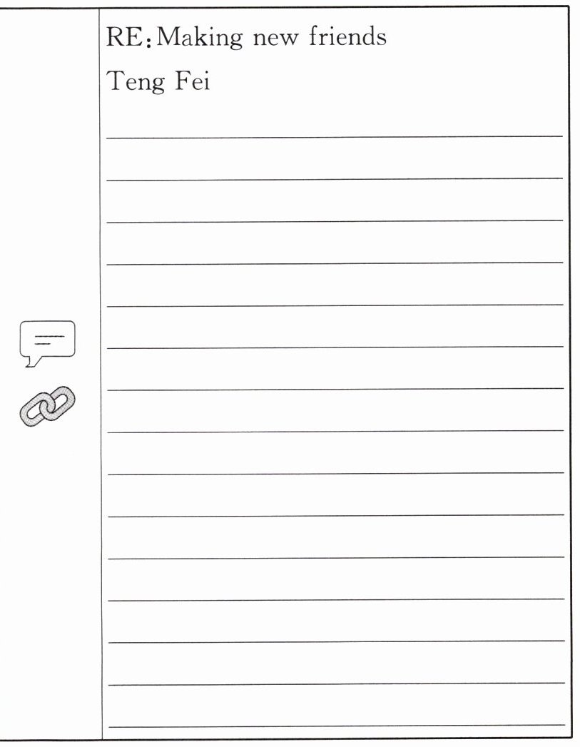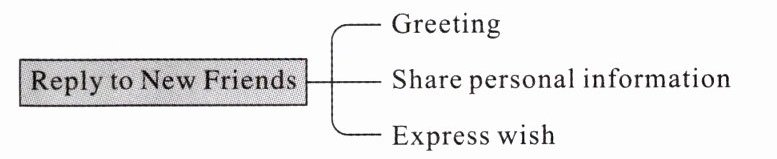 第一步:写前审题 体裁:应用文 人称:第一人称 时态:一般现在时 第二步:必备短语 1. my name 2. ...years old 3. be from 4. my favourite... 第三步:炼词成句 5. My name is Teng Fei. 6. I am twelve years old. 7. I am from Hubei, China. Now I live in Wuhan. 8. My favourite food is hot dry noodles and my favourite sport is football. 组句成篇 RE: Making new friends Teng Fei Hello, Peter! Nice to see your post. Your post is interesting. A friend is someone you get to know. My name is Teng Fei. Teng is my last name and Fei is my first name. I'm twelve years old. I'm from Hubei, China. Now I live in Wuhan. I live with my father, my mother and my sister. I have a pet dog. His name is Toby. My favourite food is hot dry noodles and my favourite sport is football. I play football with my friends every weekend. I love music too. I like playing the guitar. I'd like to be your friend. Please write to me.