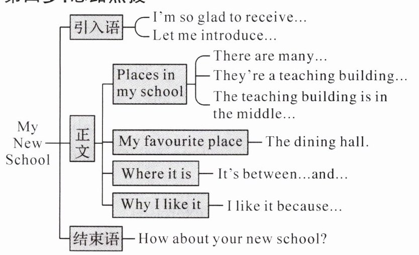Our school is very big. There are many interesting places here. They are a teaching building, a school hall, a sports field, a gym, a library, a dining hall, a science building and so on. The teaching building is in the middle. There is a library on the first floor of the teaching building. The sports field is behind the teaching building. My favourite place in the school is the dining hall. It is between the science building and the teaching building. I like it because it is very clean and the food there is delicious. I like to have meals with my classmates there.