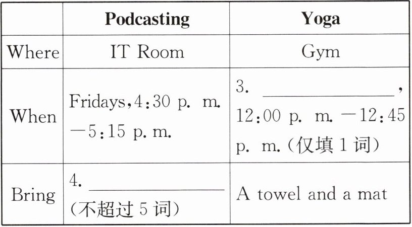 1. speaking and computer skills 2. a tree,a mountain 3. Thursdays 4. A USB stick 5. I'd like to take a yoga class. Because I want to relax myself.(答案合理即可)