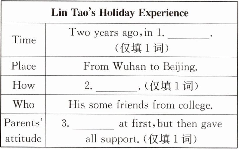 My best holiday experience was two years ago. My family lives in Wuhan,the biggest city in Central China. That summer, I decided to do something cool: cycling(骑行)from Wuhan to Beijing with some friends from college. My parents were surprised at my idea,but soon they gave me all their support(支持).