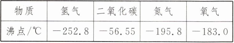 ℃时,可以将液态空气中的氮气分离。|物质|氢气|二氧化碳|氮气|氧气|