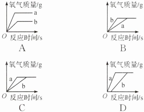 8. 取两份等质量、等浓度的过氧化氢溶液,向a中加入少量二氧化锰,b中不加二氧化锰,同时进行反应,放出氧气质量随反应时间变化的图像正确的是(