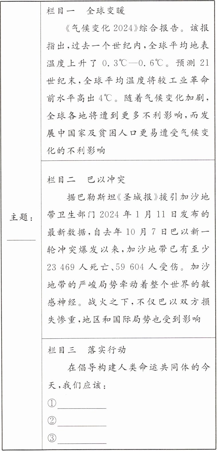 | | 栏目三 落实行动在倡导构建人类命运共同体的今天,我们应该:①______②______③______ |
