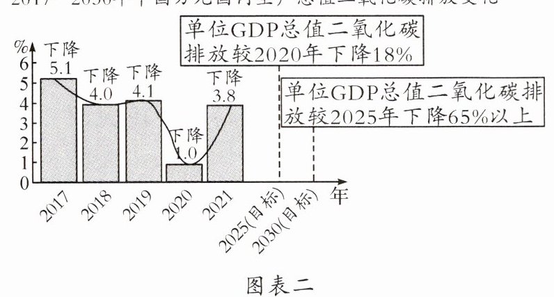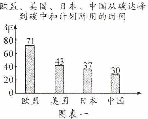 (1)答:图表一:中国计划从碳达峰到碳中和所用的时间大大低于欧盟、美国、日本。图表二:从2017—2021年,中国万元国内生产总值二氧化碳排放量实现五年连续降低,同时设定2025年、2030年单位GDP总值二氧化碳排放量大幅降低的目标。
