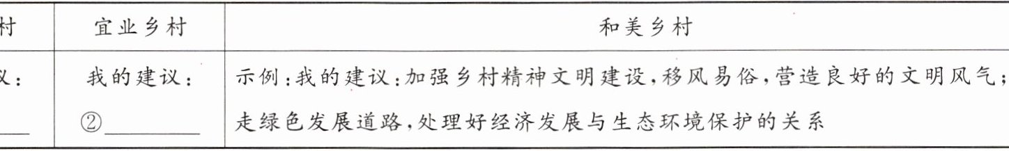|我的建议:①______|我的建议:②______|示例:我的建议:加强乡村精神文明建设,移风易俗,营造良好的文明风气;坚持走绿色发展道路,处理好经济发展与生态环境保护的关系|