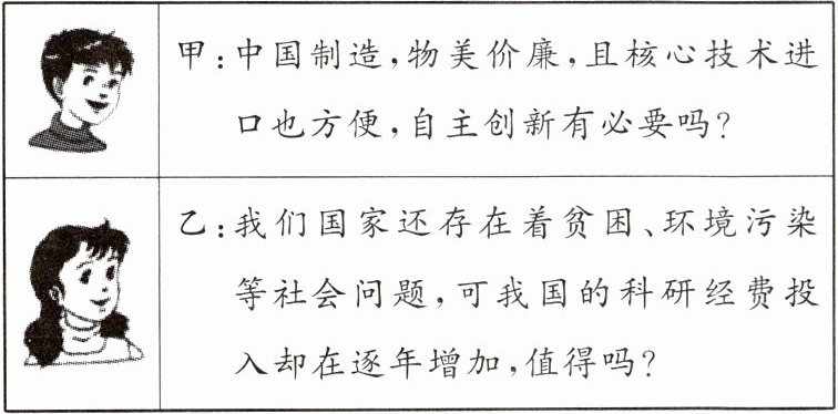 (2)答:选择甲:有必要。理由:①关键核心技术是国之重器,是要不来、买不来、讨不来的。自力更生是中华民族自立于世界民族之林的奋斗基点,自主创新是攀登世界科技高峰的必由之路。②党的十八大以来,我国加快推进科技自立自强,基础研究和原始创新不断加强,一些关键核心技术实现突破,战略性新兴产业发展壮大,成功进入创新型国家行列。③我们必须清醒认识到,我国推进高质量发展还有许多卡点瓶颈,科技创新能力还需进一步提高。④我国要建成世界科技创新强国,任重道远;科技创新是综合国力竞争的决定性因素;创新已经成为世界主要国家发展战略的重心。 或选择乙:值得。理由:①科技创新是综合国力竞争的决定性因素,创新已经成为世界主要国家发展战略的重心;创新是引领发展的第一动力;创新驱动是国家命运所系。②从短期来看,科研经费投入和贫困、环境污染等社会问题确实存在矛盾,科技经费投入的增加会影响对贫困、环境污染问题的投入。从长期来看,科技的进步有利于推动生产力发展、促进经济高质量发展,有利于实现让人民共享发展成果、解决社会主要矛盾,从而解决贫困、环境污染等问题。