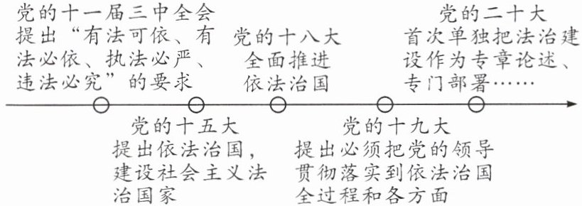 党的十一届三中全会提出“有法可依、有法必依、执法必严、违法必究”的要求→党的十五大提出依法治国,建设社会主义法治国家→党的十八大全面推进依法治国→党的十九大提出必须把党的领导贯彻落实到依法治国全过程和各方面→党的二十大首次单独把法治建设作为专章论述、专门部署……