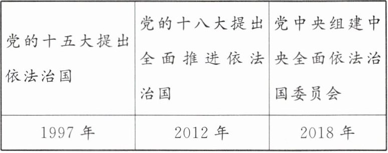 | 党的十五大提出依法治国 | 党的十八大提出全面推进依法治国 | 党中央组建中央全面依法治国委员会 |