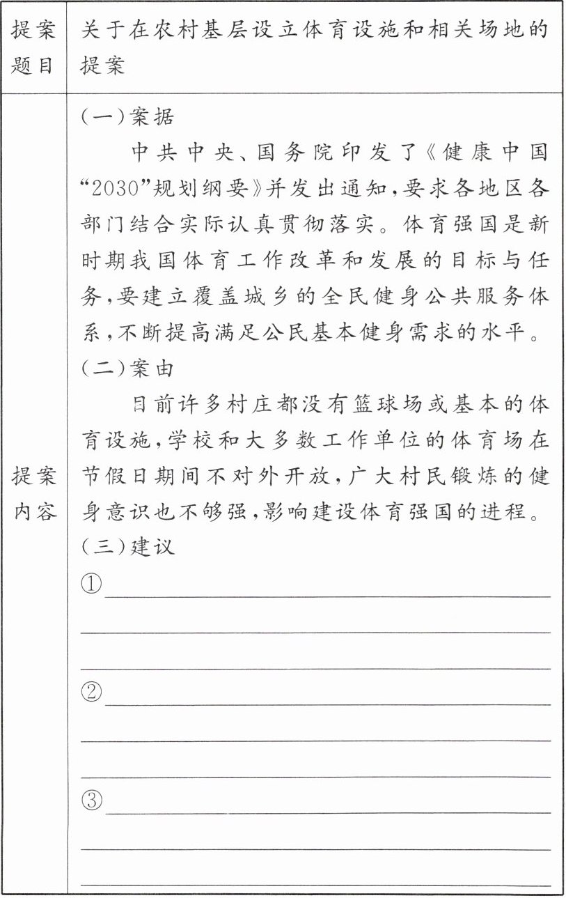 |提案内容|(一)案据中共中央、国务院印发了《健康中国“2030”规划纲要》并发出通知,要求各地区各部门结合实际认真贯彻落实。体育强国是新时期我国体育工作改革和发展的目标与任务,要建立覆盖城乡的全民健身公共服务体系,不断提高满足公民基本健身需求的水平。(二)案由目前许多村庄都没有篮球场或基本的体育设施,学校和大多数工作单位的体育场在节假日期间不对外开放,广大村民锻炼的健身意识也不够强,影响建设体育强国的进程。(三)建议①____________②____________③____________|