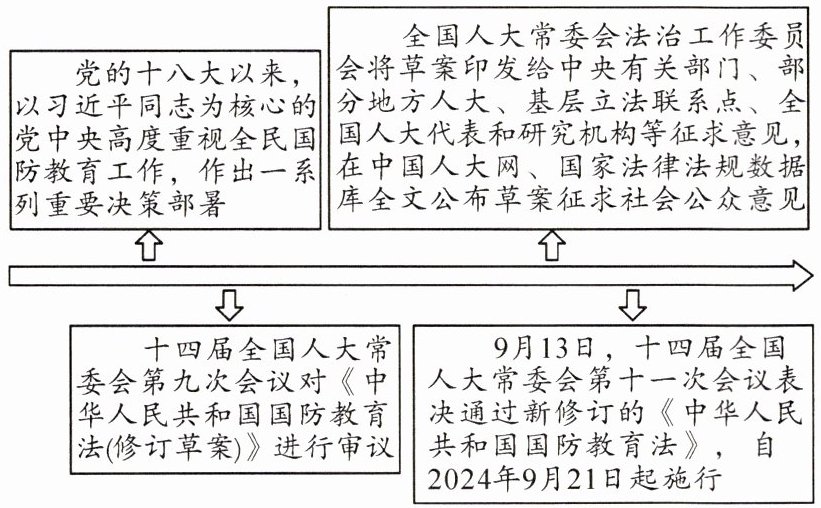 (2)答:小法同学的观点是错误的。国防教育不仅是学校的道德教育,还关系到国家安全和民族的未来。道德教育能让国防知识深入人心,但仅靠道德教育是不够的。法律具有规范和保护作用,修改完善相关法律,能为国防教育提供明确的法律依据和保障,规范国防教育的开展,增强人们的国防意识,提高全民族的国防素养,维护国家安全。
