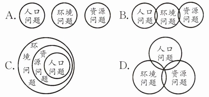 9.(跨学科·数学)图示法是我们学习和研究概念之间相互关系最直观的方法。下列关于人口问题、资源问题、环境问题三者关系图示正确的是 ( )
