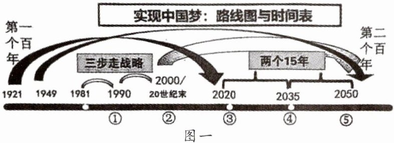 (1)请将图一“实现中国梦:路线图和时间表”中②③④⑤对应的实现目标补充完善,如①解决温饱问题。