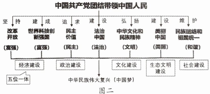 (2)实现中华民族伟大复兴的中国梦,需要多方共同发力。请你以此为主题,结合图二内容,写一个政治小论文提纲,100字左右。