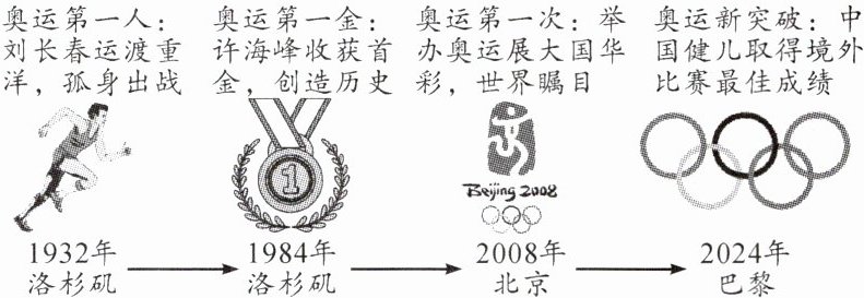 1932年洛杉矶(奥运第一人:刘长春远渡重洋,孤身出战)→1984年洛杉矶(奥运第一金:许海峰收获首金,创造历史)→2008年北京(奥运第一次:举办奥运会展大国华彩,世界瞩目)→2024年巴黎(奥运新突破:中国健儿取得境外比赛最佳成绩)