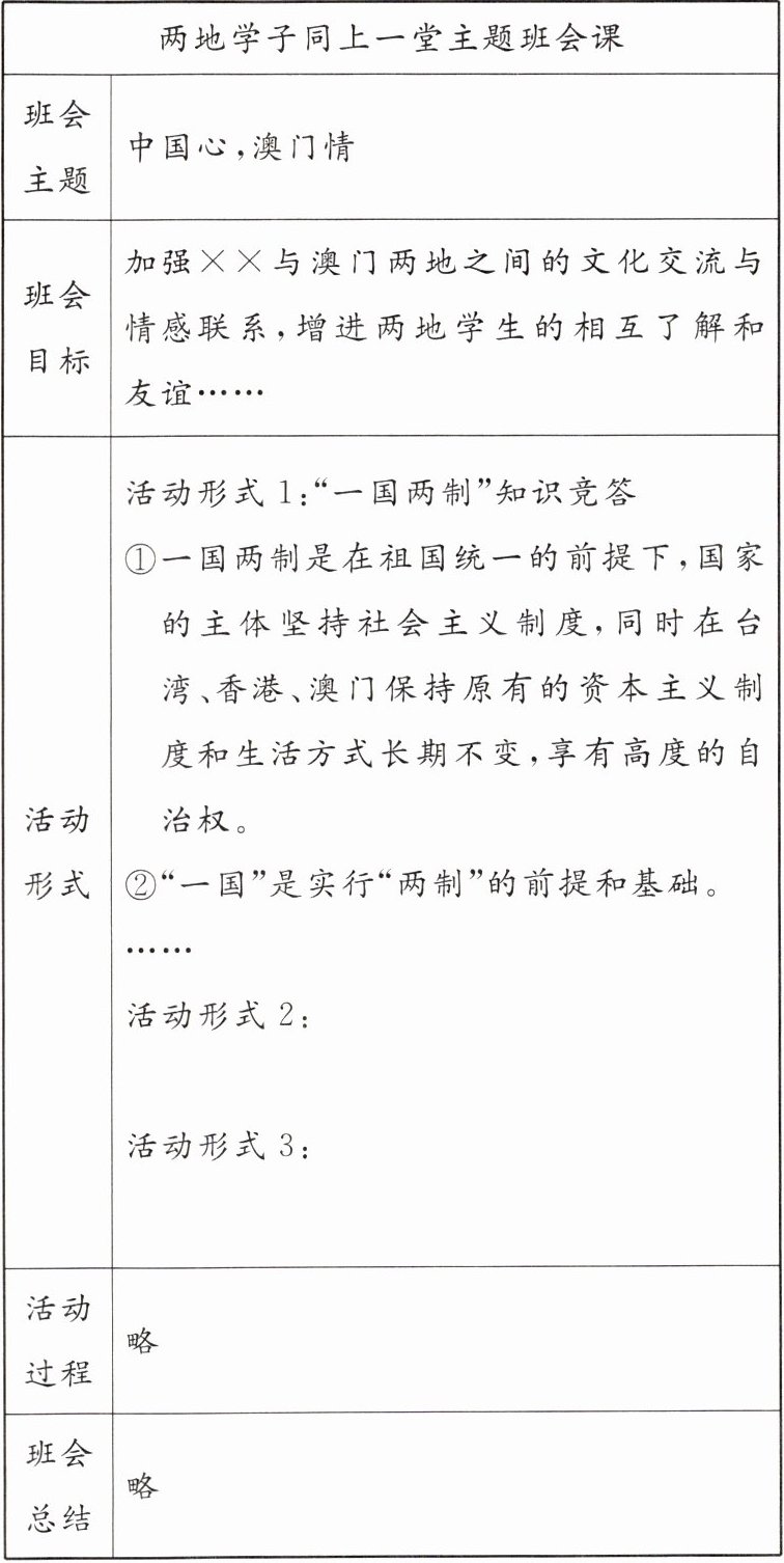 | 活动形式 | 活动形式1:“一国两制”知识竞答 ①一国两制是在祖国统一的前提下,国家的主体坚持社会主义制度,同时在台湾、香港、澳门保持原有的资本主义制度和生活方式长期不变,享有高度的自治权。 ②“一国”是实行“两制”的前提和基础。 …… 活动形式2:______ 活动形式3:______ |