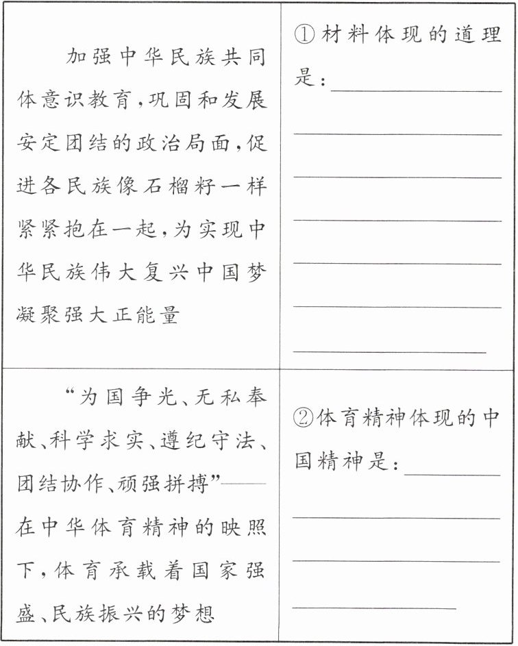 (2)①加强和巩固民族团结,维护祖国统一,是中华民族的最高利益;各族人民只有铸牢中华民族共同体意识,伟大祖国才能繁荣发展。 ②以爱国主义为核心的民族精神和以改革创新为核心的时代精神。