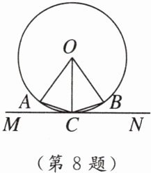 8. [2024福建中考]如图,已知点A,B在$\odot O$上,$\angle AOB= 72^{\circ}$,直线MN与$\odot O$相切,切点为C,且C为$\overset{\frown}{AB}$的中点,则$\angle ACM$等于 (