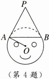 4. 如图是一个不倒翁的主视图,不倒翁的圆形脸恰好与帽子边沿$PA$,$PB分别相切于点A$,$B$,不倒翁的鼻尖正好是圆心$O$,若$∠OAB= 28^{\circ}$,则$∠APB$的度数为______