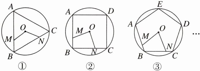 14. 如图,M,N分别是$\odot O$的内接正三角形ABC、正方形ABCD、正五边形ABCDE…的边AB,BC上的点,且$BM= CN$,连接OM,ON.