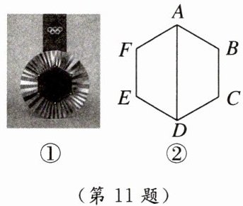 11. 情境题 体育赛事 中国体育代表团在巴黎奥运会上取得了优异的成绩,图①是2024年巴黎奥运会的一枚金牌,金牌正中间镶嵌了一块正六边形铁块.这个正六边形铁块的示意图如图②所示,连接AD,已知该正六边形ABCDEF的周长约为$18\sqrt {5}mm$,则AD的长约为(