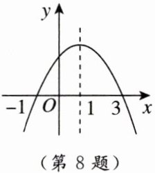 8. [2025亳州月考]二次函数 $ y = ax^2 + bx + c $ 的图象如图所示,给出下列说法:① $ ac > 0 $;② $ 2a + b = 0 $;③ $ a + b + c = 0 $;④当 $ x > 1 $ 时,$ y $ 随 $ x $ 的增大而增大;⑤当 $ y > 0 $ 时,$ -1 < x < 3 $。其中,正确的说法有(