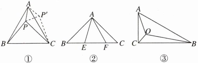 (1)如图①,等边三角形ABC内有一点P,若点P到顶点A,B,C的距离分别为3,4,5,求∠APB的度数. 为了解决本题,我们可以将△ABP绕顶点A旋转到△ACP'处,此时△ACP'≌△ABP,连接PP',这样就可以利用旋转变换,将三条线段PA,PB,PC转化到一个三角形中,从而求出∠APB=