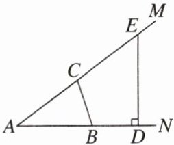 12. [2024北京中考节选]如图,已知∠MAN= α(0°<α<45°),点B,C分别在射线AN,AM上,将线段BC绕点B顺时针旋转180°-2α得到线段BD,过点D作AN的垂线交射线AM于点E. 当点D在射线AN上时,求证:C是AE的中点.