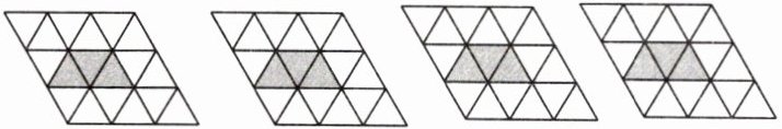 8. 数学活动课上,张老师组织同学们设计多姿多彩的几何图形,如图都是由边长为1的小等边三角形构成的网格,每个网格中有3个小等边三角形已涂上阴影,请同学们在余下的空白小等边三角形中选取1个涂上阴影,使得4个阴影小等边三角形组成一个轴对称图形或中心对称图形,请画出4种不同的设计图形.(规定:凡通过旋转能重合的图形视为同一种图形)