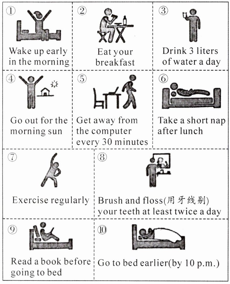 3.C[解析]细节理解题。根据图片①"Wake up early in the morning"可知,我们应该早起。故选C。