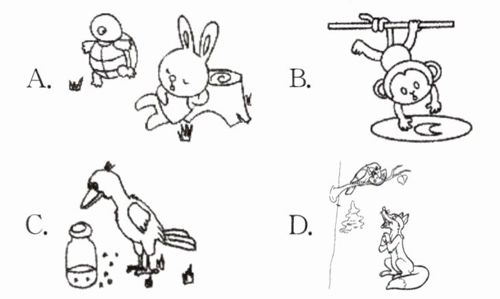 4.D [解析]图片理解题。文中提到黑猩猩打架后,输的黑猩猩会先伸手示好,等赢的黑猩猩也伸手时又开始打架,说明黑猩猩这种行为是偷偷摸摸、狡猾的。“sneaky”意为“鬼鬼祟祟的;狡猾的”,D 选项图片中狡猾的狐狸在骗乌鸦嘴里的肉。故选 D。