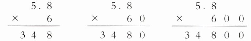 $\begin{array}{r} 5.8\\ ×6\\ \hline 348\end{array} $ $\begin{array}{r} 5.8\\ ×60\\ \hline 3480\end{array} $ $\begin{array}{r} 5.8\\ ×600\\ \hline 34800\end{array} $