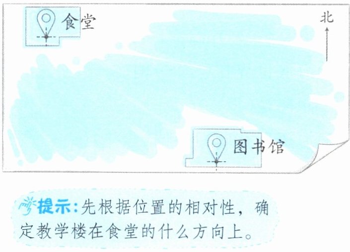 提示:先根据位置的相对性,确定教学楼在食堂的什么方向上。