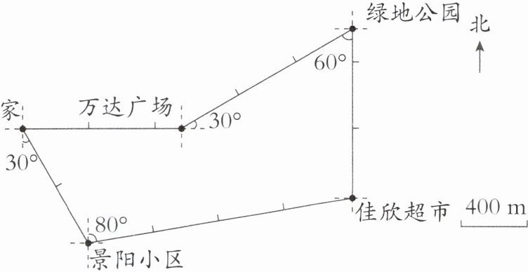 4. 华华跟爸爸、妈妈晚饭后一起散步,回家后绘制了一幅简单的路线图。(17分)